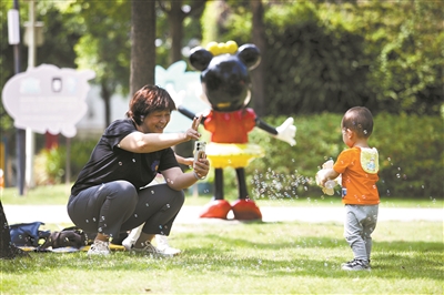 在海珠儿童公园,家长和小朋友在开心地玩泡泡。