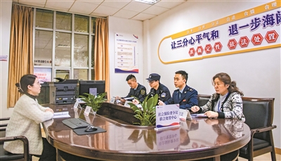 在社保争议联合处置中心,多部门工作人员与企业代表面谈。