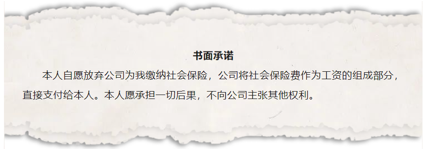 这种承诺书你见过吗?有的公司在签订劳动合同时,会要求员工签订这样一份自愿放弃社保的承诺书。遇见这种情况,请果断拒绝!还有的员工,为了少缴社保多拿工资,主动交上承诺书,放弃社保,要求公司将社保转成工资支付给自己,千万别算小账、计小利!