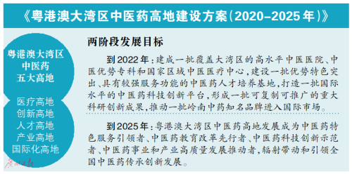 方案明确,促进融合发展,打造创新高地。设立粤港澳大湾区中医药科技研发专项,推进粤港澳大湾区中医药大科学计划,研究谋划中医药领域国家技术创新中心、国家工程研究中心,围绕中医药重大科学问题,建立多学科融合的科研平台。