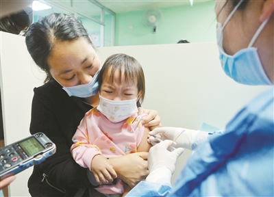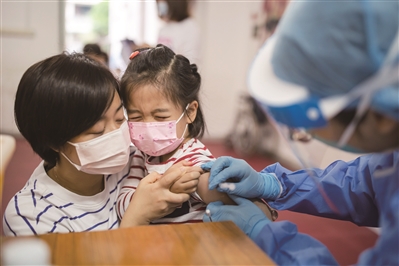 幼儿园的小朋友在家长的陪伴下接种疫苗。