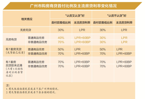 记者对比发现,最大的变化还是在于“无房有贷”的情况,新政之下,“无房有贷”的购房者在广州购买普通商品住房,首付比例将从4成降至3成,房贷利率将从LPR+60BP降至LPR;购买非普通商品住房,首付比例将从7成降至3成,房贷利率将从LPR+60BP降至LPR。