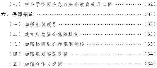 (七)中小学校园应急与安全教育提升工程。及时总结经验,创新机制,加强中小学校园应急与公共安全知识教育。进一步规范校园应急与安全教育,每名学生每年接受应急与公共安全知识教育的日常教学和实践活动累计不少于8小时,各学校每年组织开展3次以上的应急演练。将应急与安全教育前置,在全市范围继续推进应急与安全教育进幼儿园项目,编制教材、完善情景教育设施等,开展体验式、互动式教学,加大幼儿基本安全知识和自我保护能力教育,将学校、家庭、社会的应急与安全教育有效联接,发挥学生、家庭的辐射带动作用,不断提升全社会的应急意识和避险自救能力。