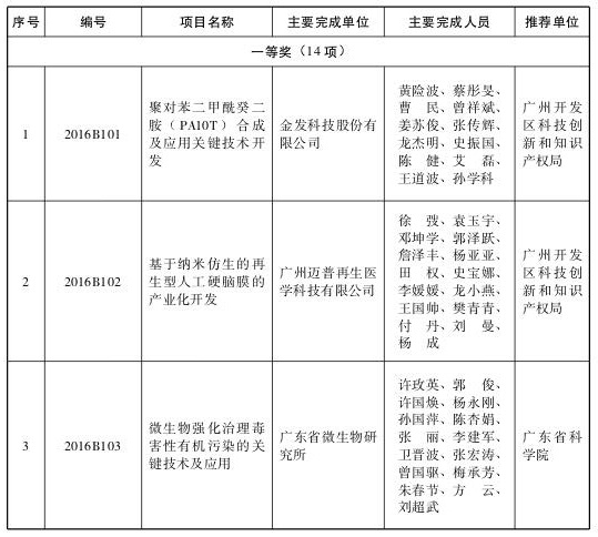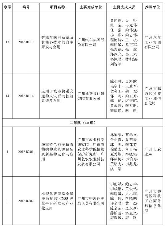 各区人民政府,市政府各部门、各直属机构:根据《广州市科学技术奖励办法》,经广州市科学技术奖评审委员会评定,市政府同意授予何晓顺教授、蒋宗勇研究员2016年广州市科学技术市长奖;授予“聚对苯二甲酰癸二胺(PA10T)合成及应用关键技术开发”等14项科技成果2016年广州市科学技术进步奖一等奖;授予“华南特色茄子抗青枯病种质资源创新及新品种选育与应用”等40项科技成果2016年广州市科学技术进步奖二等奖;授予“聚烯烃光稳定化技术的应用研究”等41项科技成果2016年广州市科学技术进步奖三等奖。