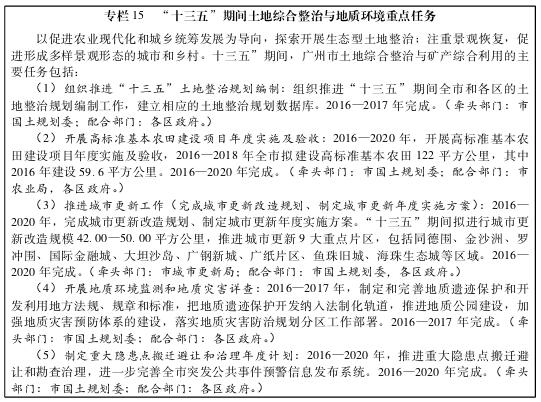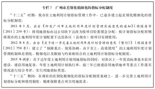 进一步争取国家和省在土地利用方面的相关支持政策。结合批复的广州市城乡统筹土地管理制度创新试点方案和国家土地资源管理工作要求,继续支持广州市在成片生态用地只征不转、城市生态用地差别化管理、中心城区外农用地审批、围填海造地、集体建设用地流转等政策方面的创新和实施,逐步完善“十三五”期间的土地管理顶层制度设计。