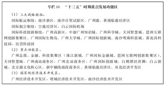 保障全市28个重点发展功能区用地(见附图7),促进形成“三大战略枢纽、一江两岸三带、多点支撑”的城市发展格局,构建枢纽型网络城市格局。重点打造“三大战略枢纽”,重点保障国际航运、航空枢纽建设的基础设施、物流及临港关联的先进制造业、战略性新兴产业用地,优先保障国际科技创新枢纽相关的知识、资本、技术密集型科技产业用地。围绕珠江经济带,建设总部金融创新产业集聚区,重点保障总部经济、现代服务业、科技型服务经济等用地需求。建设三大国家级经济技术开发区,保障广州开发区、南沙开发区、增城开发区先进制造业项目和战略性新兴产业用地,进一步提升土地集约利用水平;优先保障居住、基础设施等配套用地,推进职住平衡。对接落实《广州制造2025战略规划》,优化提升装备制造业发展,大力建设龙穴岛高端船舶和海洋工程装备、黄埔智能装备、大岗重大装备等装备产业基地,支持和保障智能装备及机器人、新一代信息技术、节能与新能源汽车、新材料与精细化工、生物医药与健康医疗、能源及环保装备、轨道交通、高端船舶与海洋工程装备、航空与卫星应用、都市消费工业等专业化用地需求。建设特色功能区,挖掘各自特色,重点保障文化旅游、教育培训、文化服务、创意产业等类型特色产业用地。