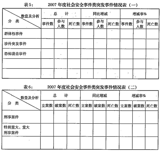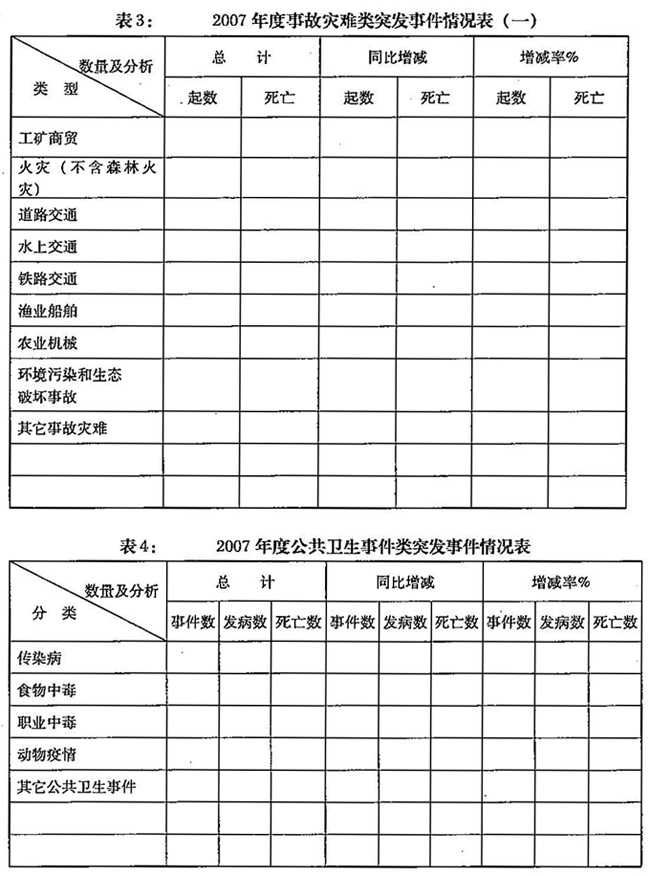 按照自然灾害、事故灾难、公共卫生事件和社会安全事件四大类,分别汇总总体情况及其所包含分类别的具体情况。主要包括2007年各类突发事件发生起数、伤亡人数、经济损失、与往年比较情况,以及特别重大、重大、较大三个级别的有关情况等,并对各类突发事件发生的主要特点进行分析。