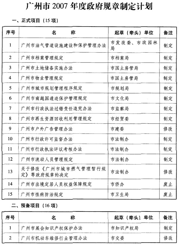 印发广州市2007年度政府规章制定计划的通知