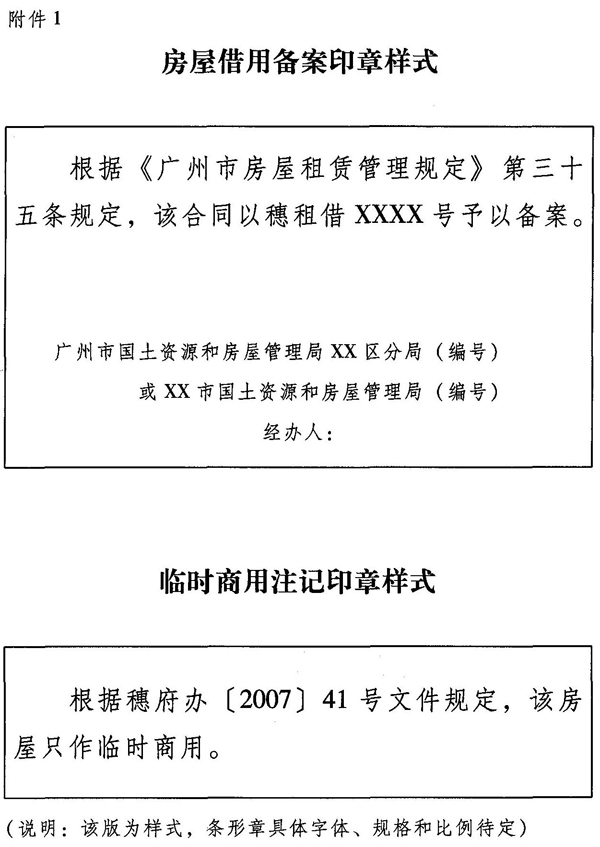 3.出借房屋给他人作生产经营场所使用的,借用双方应到国土房管部门或其委托的街(镇)出租屋管理服务中心办理借用合同备案手续,由受理单位在借用合同上加盖“根据《广州市房屋租赁管理规定》第三十五条规定,该合同以穗租借XXXX号予以备案”的印章,并作“根据穗府办[2007]41号文件规定,该房屋只作临时商用”注记(见附件1);