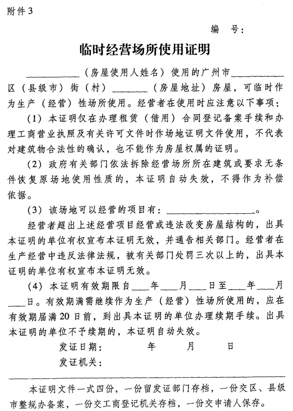 (1)《临时经营场所使用证明》由当地镇政府、街道办事处出具,并加盖全市统一规格和样式的临时经营场所使用证明业务专用公章(见附件2),有效期不超过1年。《临时经营场所使用证明》应在受理申请人申请资料之日起10个工作日内发出;