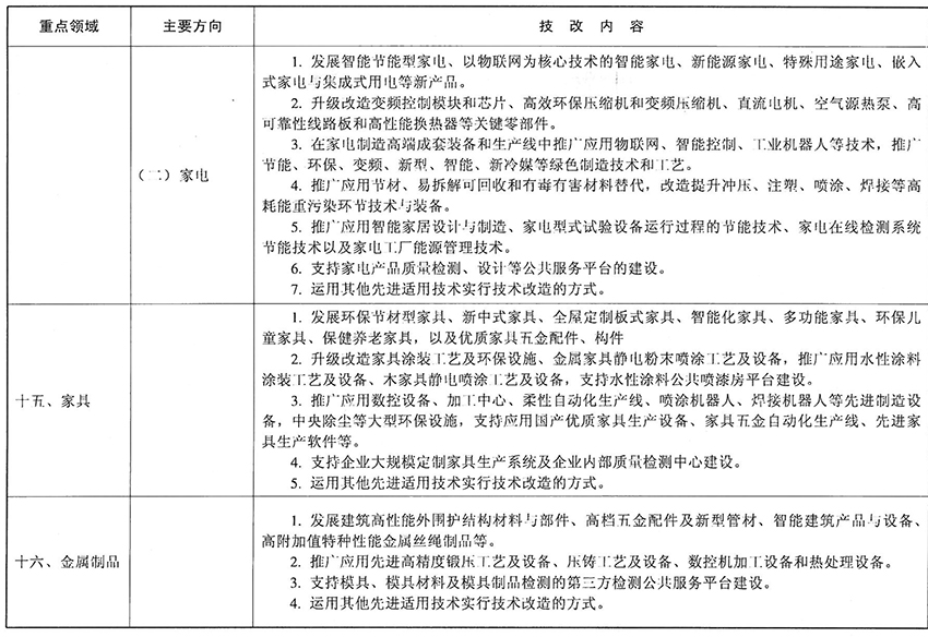 (三)启动实施“机器换人”行动。引导和鼓励企业应用先进适用的智能装备进行技术改造,培育“机器换人”示范企业,在汽车、船舶、轨道交通、成套设备等机械装备企业推进应用工业机器人等智能装备对生产系统进行技术改造;在食品、医药、化工等流程类制造企业推进集成制造技术应用改造;在家具、服装等个性化定制领域组织实施柔性智能化生产改造。支持大、中型骨干企业和行业领先企业率先改造建设智能车间和智能工厂,引导推动小微型企业加快使用智能单机设备等进行智能生产线改造,扶持并推广一批智能化改造示范项目。