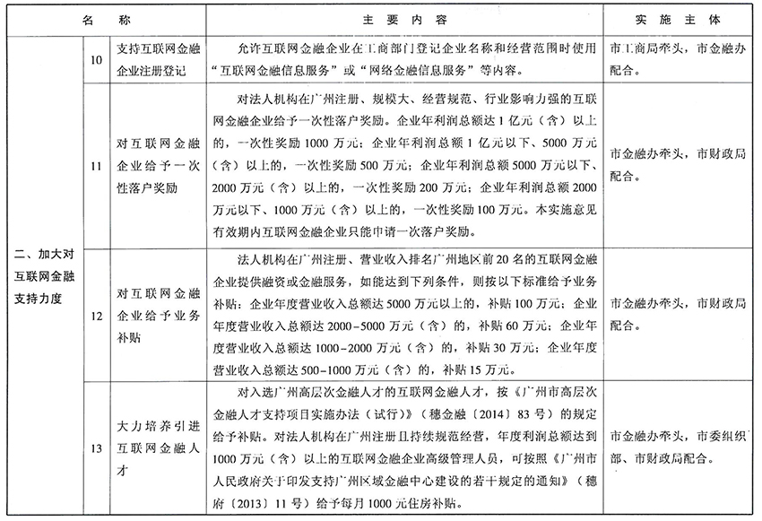 (十五)对互联网金融企业给予业务补贴。法人机构在广州注册、营业收入排名广州地区前20名的互联网金融企业提供融资或金融服务,如能达到下列条件,则按以下标准给予业务补贴:企业年度营业收入总额达5000万元以上的,补贴100万元;企业年度营业收入总额达2000-5000万元(含)的,补贴60万元;企业年度营业收入总额达1000-2000万元(含)的,补贴30万元;企业年度营业收入总额达500-1000万元(含)的,补贴15万元。