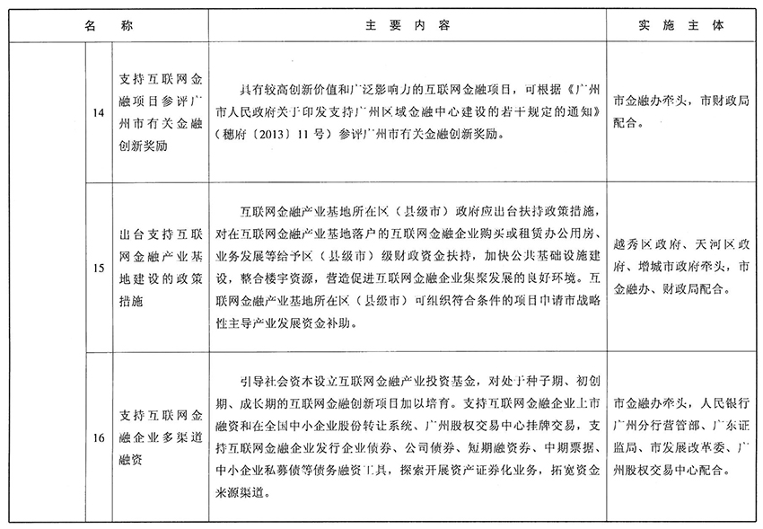 (十七)支持互联网金融项目参评广州市有关金融创新奖励。具有较高创新价值和广泛影响力的互联网金融项目,可根据《大阳城集团娱乐视频关于印发支持广州区域金融中心建设的若干规定的通知》(穗府〔2013〕11号)参评广州市有关金融创新奖励。