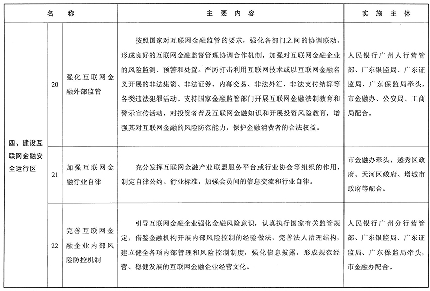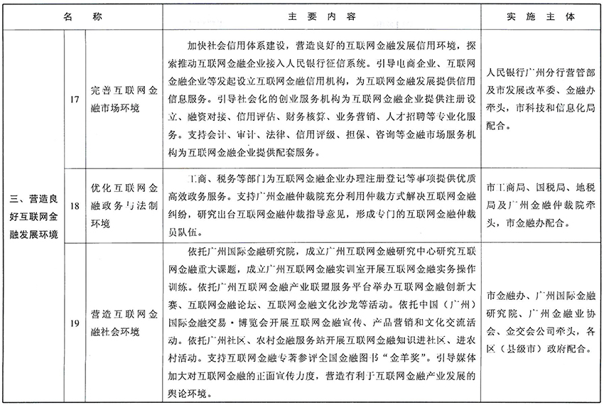 (二十一)优化互联网金融政务与法制环境。工商、税务等部门为互联网金融企业办理注册登记等事项提供优质高效政务服务。支持广州金融仲裁院充分利用仲裁方式解决互联网金融纠纷,研究出台互联网金融仲裁指导意见,形成专门的互联网金融仲裁员队伍。