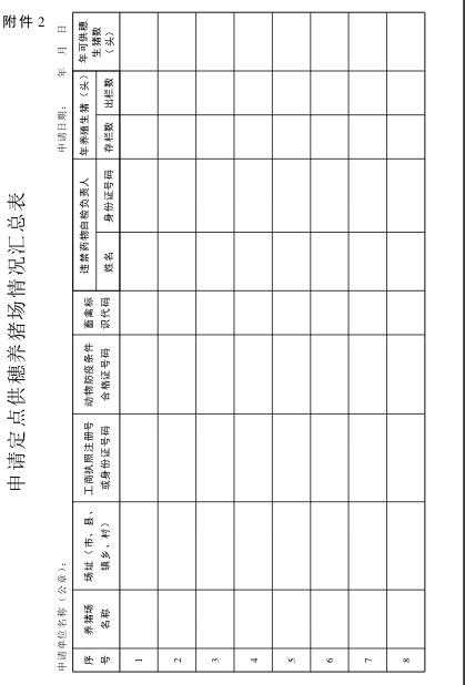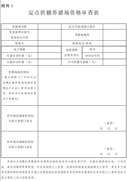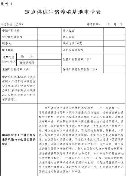 (二)申请单位向广州市农业行政主管部门提出申请。生猪养殖企业须提交营业执照复印件,生猪养殖合作社须提供章程、营业执照的复印件,同时一并提交以下材料:《定点供穗生猪养殖基地申请表》、申请单位的生猪违禁药物自检制度、《申请定点供穗养猪场情况汇总表》、经养猪场所在地县级以上畜牧兽医行政主管部门审查同意并加盖公章的《定点供穗养猪场资格审查表》等材料(详见附件)。