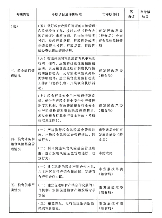 (二)评审。由市发展改革委(粮食局)组织市财政局、农业局、统计局、食品药品监管局和中国农业发展银行广东省分行营业部(以下简称省农发行营业部)等单位按照各自职责就本单位负责考核的内容提出书面意见,并对各区(县级市)填报的《广州市粮食安全责任考核表》进行复核考评。