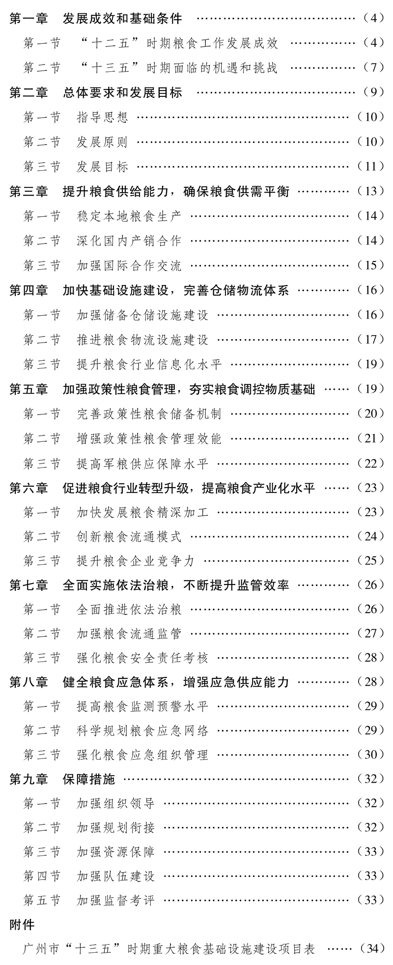 (一)加快推进粮食现代物流设施建设。统筹整合存量资源,优化增量资源,提升整体功能。引导中心城区粮食批发市场转型升级,在南沙、黄埔、番禺、白云区建设大型粮食批发市场或综合性粮食物流、加工、贸易基地。加快推进粮食物流园区建设,重点推进黄埔惠安明珠粮食物流加工中心和笔岗粮食仓储加工设施、广州长兴智慧粮食储备库等项目建设。