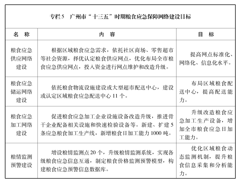 (五)粮食应急保障能力逐步增强。进一步健全粮食应急机制,修订《广州市粮食应急预案》,编制《广州市粮食应急预案操作指引》,建立粮食应急专家数据库和调用机制。定期和不定期开展粮食应急演练,着力强化应急保障队伍技能培训,不断优化调整粮食应急网络布局,极大提升了应急保障能力。“十二五”期末,全市粮食应急供应网点406个,应急运输企业25家,应急加工企业20家。