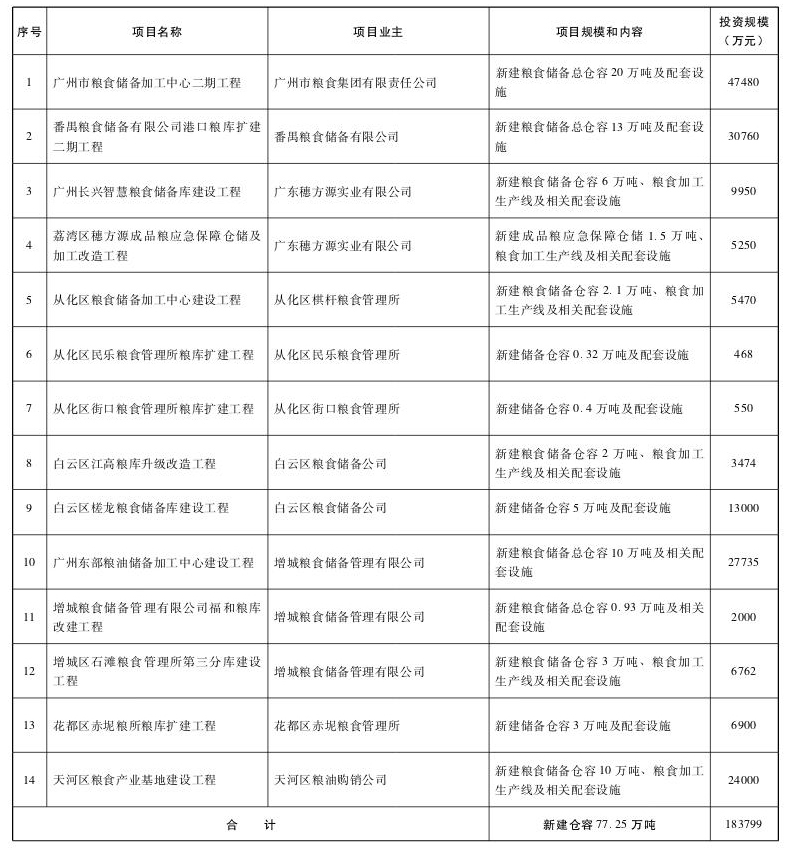 广州市“十三五”时期重大粮食基础设施建设项目表