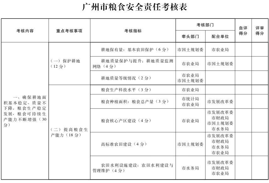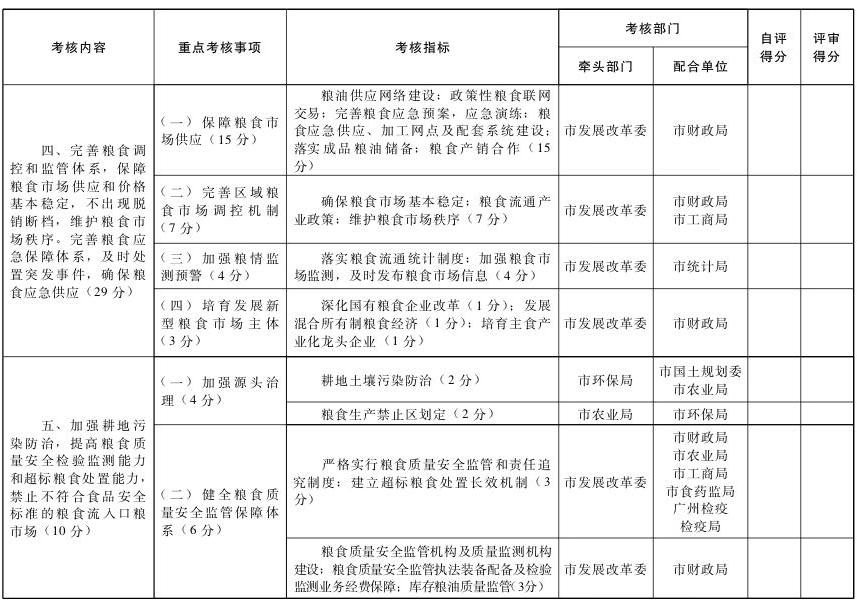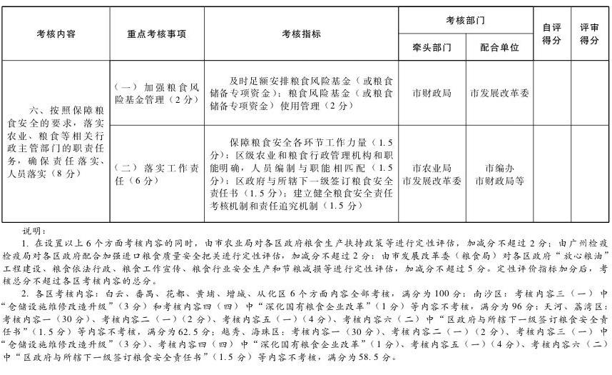 第五条 考核内容主要为各区政府粮食安全保障责任落实情况,包括增强粮食可持续生产能力、保护种粮积极性、增强地方粮食储备能力、保障粮食市场供应、确保粮食质量安全、落实保障措施等6个方面。根据各区粮食工作不平衡的实际,对不具备条件开展的工作,不列入相应区的考核项目,各区考核的具体内容详见附件。