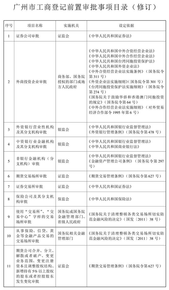 《广州市工商登记前置审批事项目录(修订)》已经市人民政府同意,现印发给你们,请认真执行。执行中遇到问题,请径向市工商局反映。