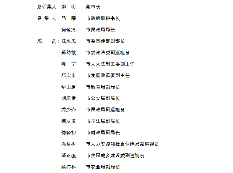 联席会议办公室设在市民政局,承担联席会议日常工作,办公室主任由市民政局分管负责人兼任。联席会议联络员由各成员单位指定相关处室负责人担任。联席会议不纳入市级议事协调机构管理。