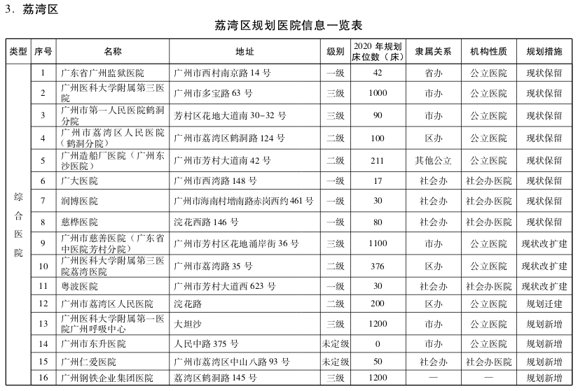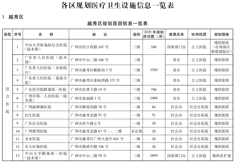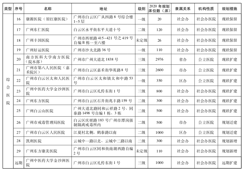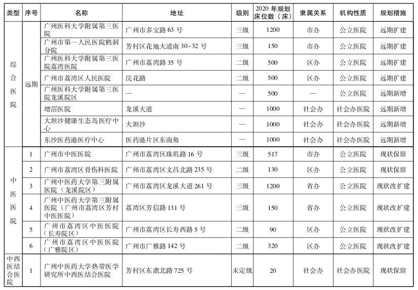 2020年,广州市共规划综合医院169间,其中现状保留87间,规划新增22间,改扩建(含迁建)60间。