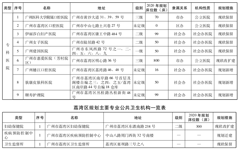 2020年,广州市共规划专科医院96间,其中现状保留61间,规划新增21间,改扩建(含迁建)14间。