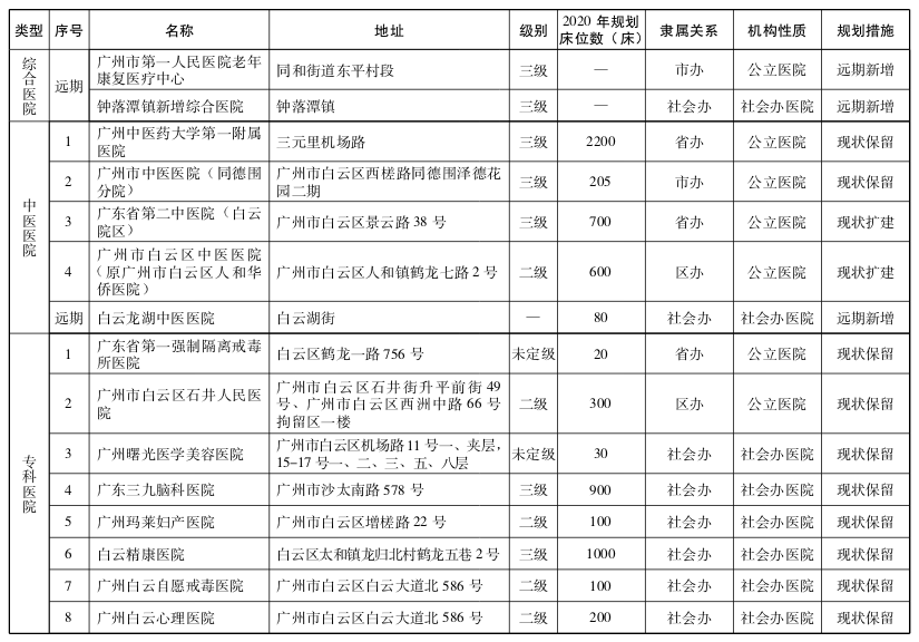 白云区为扩容提质区。白云南部未来应实现“量足”到“质优”的转变,重点调整医疗资源布局和结构,重点增加康复、老年护理、妇女儿童、精神卫生等紧缺专科的床位配置;白云北部着重扩容,在钟落潭镇、龙归城等区域规划设置相应规模的公立医疗卫生机构,适当增加床位配置;支持区内资源富余的二级以下公立综合医院,逐步转型为护理院、康复医院或者社区卫生服务机构,至少设置1家护理院、康复医院或医养结合机构;重点引进高水平社会办医疗机构,建设广州国际健康产业城、广州国际专科医疗中心。
