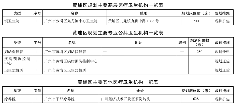 黄埔区为扩容提质区。调整黄埔南部医疗资源布局和结构,重点增加黄埔北部综合、妇女儿童、肿瘤、康复等公立医疗资源配置;鼓励社会资本设置第三方检验检测、肿瘤、老年护理、康复、健康管理、互联网医院等医疗机构;至少设置1家护理院、康复医院或医养结合机构;大力发展健康产业,建设广州科学城、广州国际生物岛、中新广州知识城。