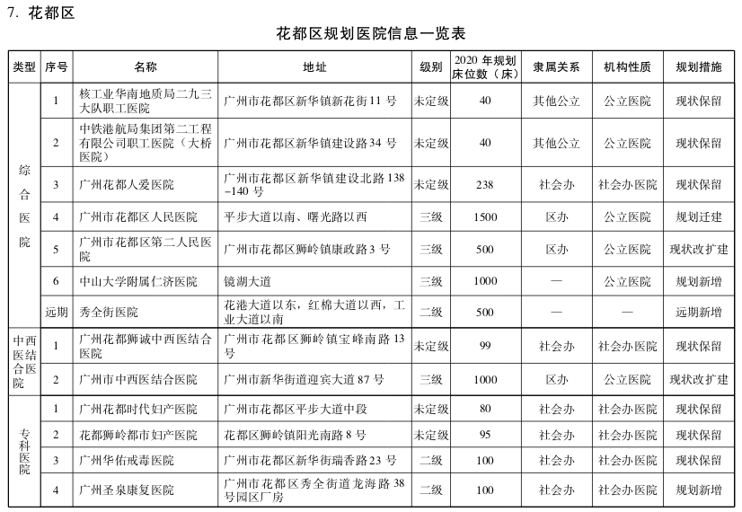 花都区为扩容提质区。加大对区域医疗资源的配置力度,重点增加妇女儿童、脑科、康复、口腔等公立医疗资源配置;增加镇卫生院床位配置;鼓励优质社会资本提供妇产、老年护理、康复、自愿戒毒等专科服务;至少设置1家护理院、康复医院或医养结合机构。