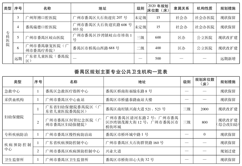 番禺区为扩容提质区。重点调整区域医疗资源布局和结构,有针对性地增加妇女儿童、中西等专科配置,除现有建设项目外,严控公立医院规模、床位不合理扩张;增加基层医疗卫生机构数量;鼓励社会资本引进国际化高端医疗资源;支持区内资源富余的二级以下公立综合医院,逐步转型为护理院、康复医院或者社区卫生服务机构,至少设置1家护理院、康复医院或医养结合机构。