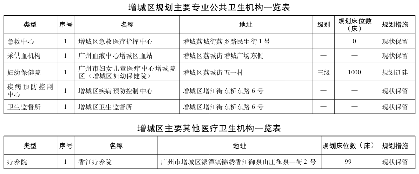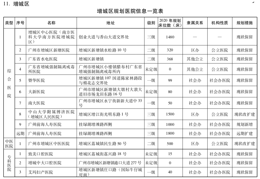 增城区为扩容提质区。加大对区域医疗资源的配置力度,重点增加综合、妇女儿童等公立医疗资源配置;鼓励社会资本引进引进妇产、老年护理、康复、口腔等医疗机构;至少设置1家护理院、康复医院或医养结合机构;建设增城高滩健康小镇。允许增城区在现有规划基础上,规划新增1家以上综合或专科医院。