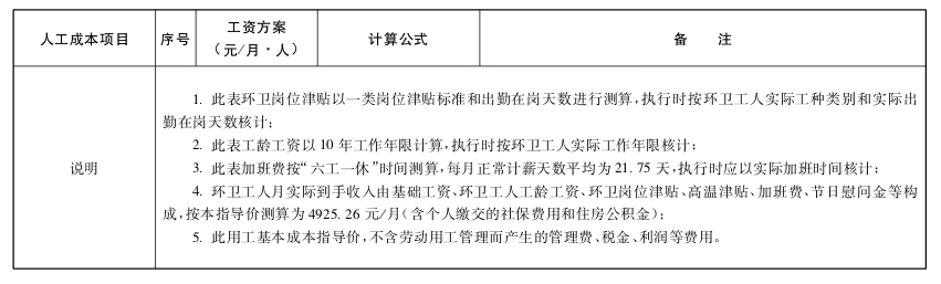 (二)环卫用工成本指导价包括基础工资、环卫岗位津贴、环卫工人工龄工资、高温津贴、加班或者延长工作时间工资、国家法定节日和市环卫工人节慰问金、社会保险(单位缴纳部分)、住房公积金(单位缴纳部分)8个部分,其他项目按照现有的法律、法规执行。
