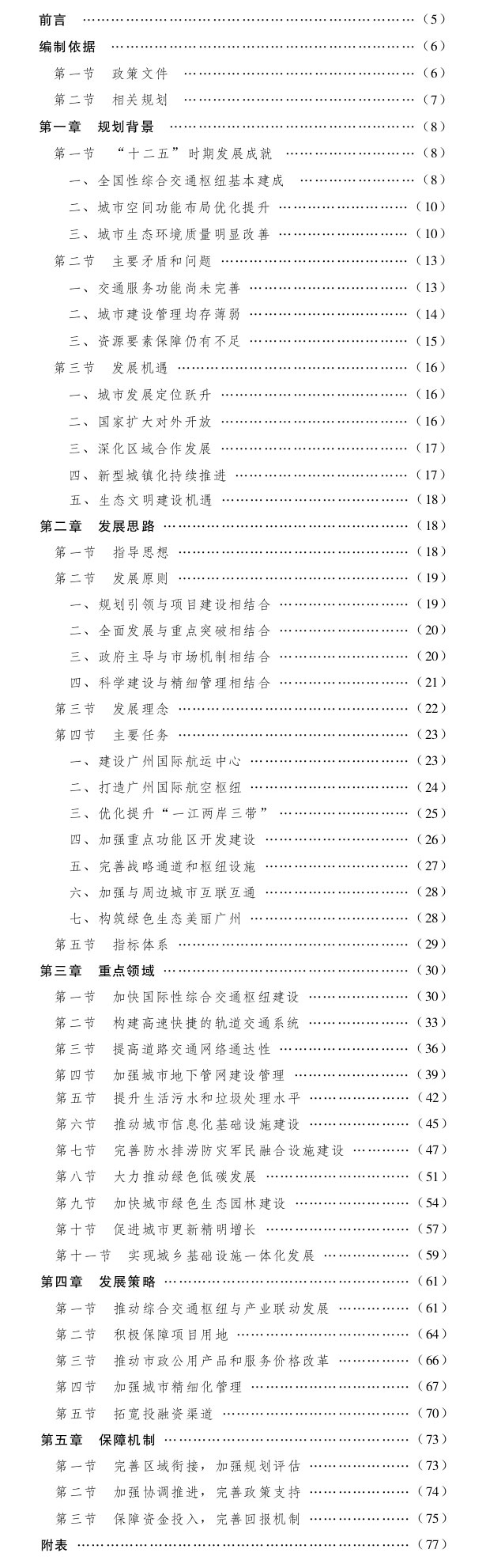 城市基础设施包括交通(包括航空、港口、铁路、城际轨道交通、城市轨道交通、高快速路、公路、市政道路)、供水、污水处理、河涌整治、垃圾处理、园林绿化等。根据《国务院关于加强城市基础设施建设的意见》(国发〔2013〕36号)、《广东省人民政府关于加快推进城市基础设施建设的实施意见》(粤府〔2015〕56号),围绕建设国家中心城市总目标和建成更高质量小康社会的目标,为发挥新一轮基础设施建设对经济、社会发展的支撑作用,广州市发展和改革委员会牵头研究提出《广州市城市基础设施发展第十三个五年规划》(以下简称《规划》)。