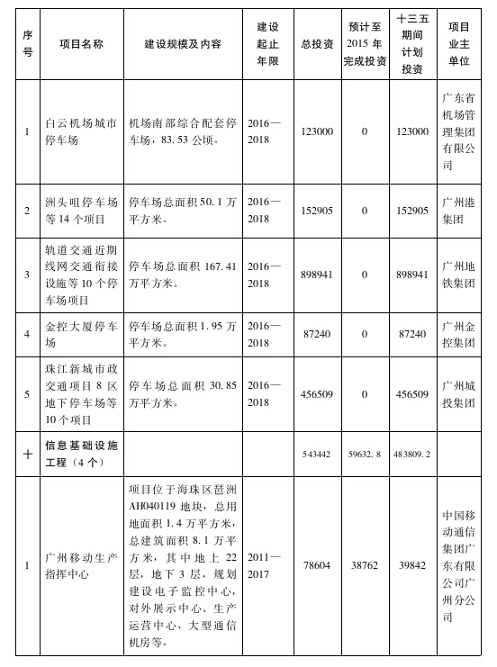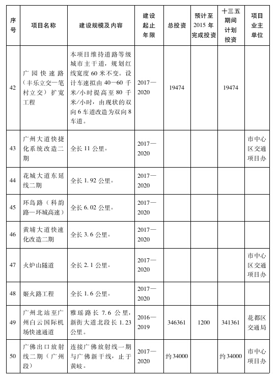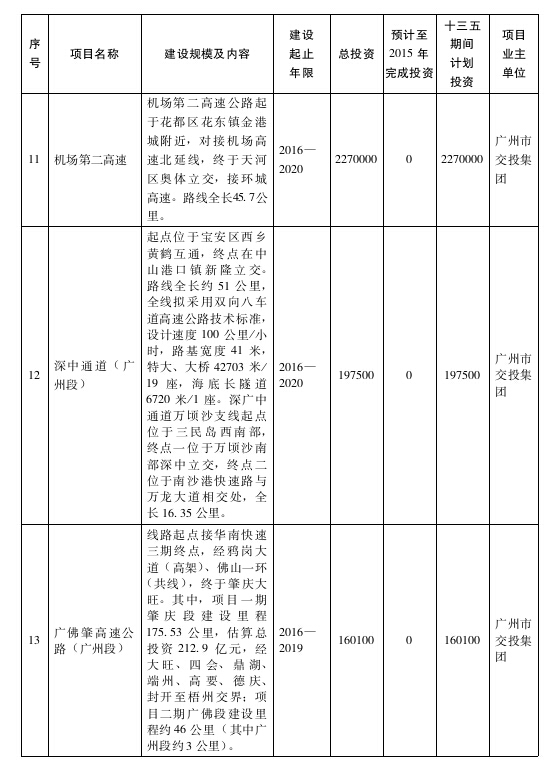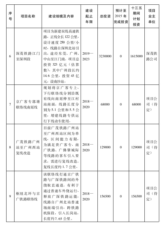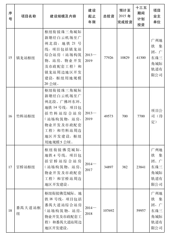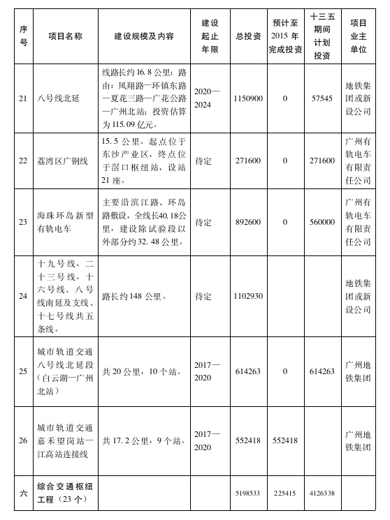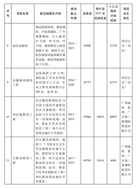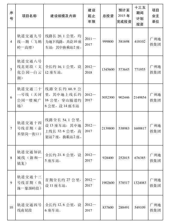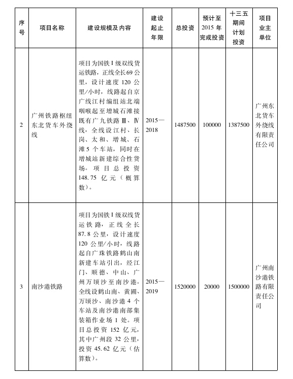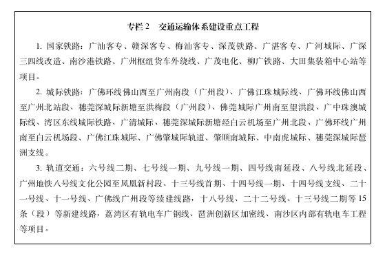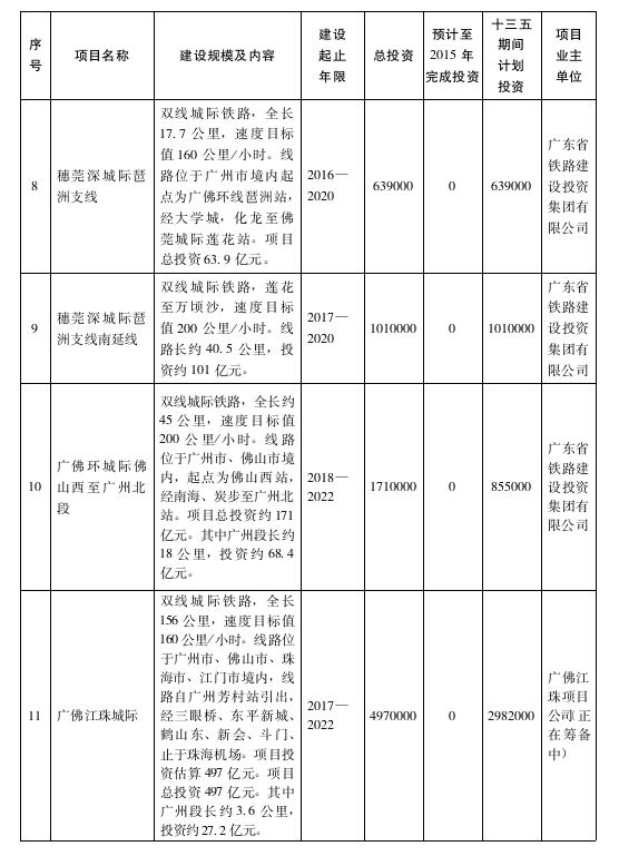 ——铁路及城际轨道交通。“十二五”期间,相继开通运营武广客专、广深港客专、贵广铁路、南广铁路等多条国家干线铁路,广州辐射华中、中南、西南地区、连接港澳的通道更趋完善。广珠城际开通运营,广清城际、穗莞深城际、广佛环城际、佛莞城际等8个城际轨道交通项目开工建设。
