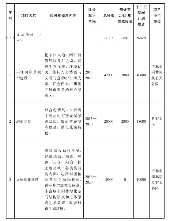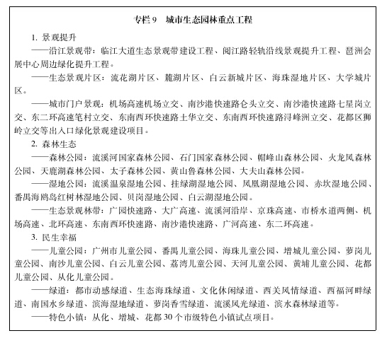 (三)提升公共空间的绿化品质,实施“森林围城、森林进城”行动计划,建设花城花景、大型公园、开放式绿地、“一江两岸”绿化景观带、四季主题花景,完善绿道网络体系,发展立体绿化和乡村绿化,形成岭南园林城市的风貌。