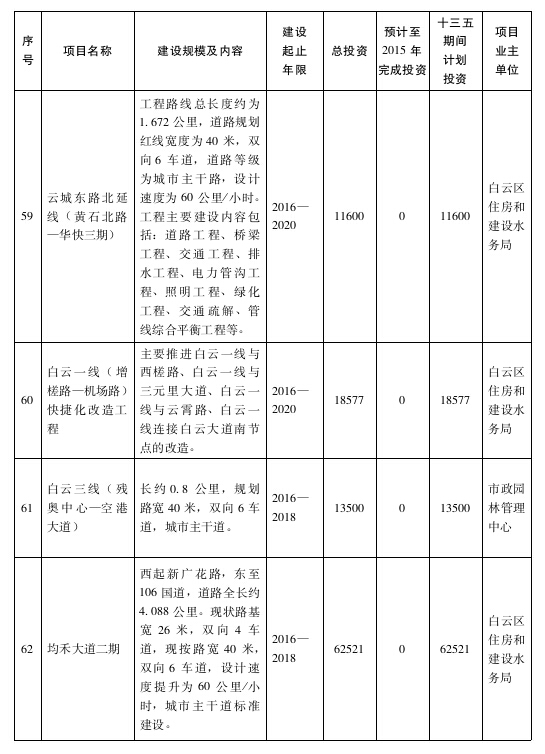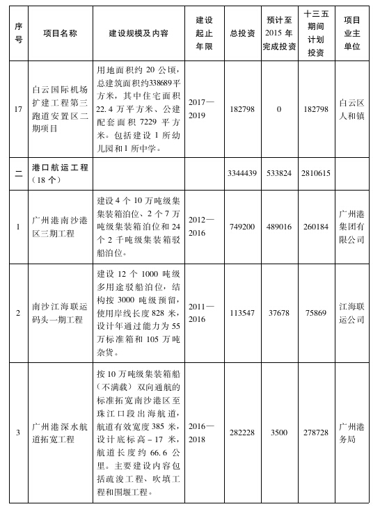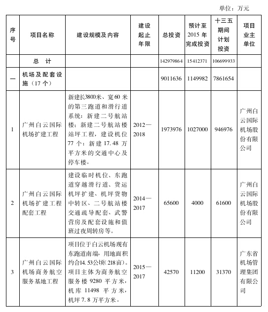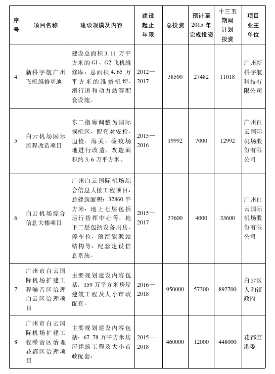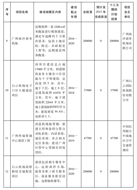 ——机场扩建。“十二五”期间,广州白云国际机场实施一系列扩建工程,完善机场服务设施,提升整体服务功能,已开通国内外航线200多条,第三跑道投入运营。2015年旅客吞吐量达5520万人次,居全国三大枢纽机场行列,全球排名第15位,发挥了国际中转、对外门户、国内枢纽功能,已经形成覆盖亚太地区、辐射全球的航线网络。