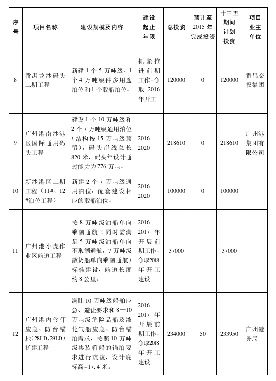 ——港口建设。广州港加快建设集装箱深水泊位、浚深出海航道,积极开辟集装箱班轮航线,港口货物吞吐量、港口集装箱吞吐量持续高速增长。2015年,港口货物和集装箱吞吐量分别达5.15亿吨和1755万标箱,分别居世界第5位和第8位。与世界100多个国家和地区的400多个港口建立了海运贸易往来。广州港出海航道三期、南沙港区三期工程建成投入运营。