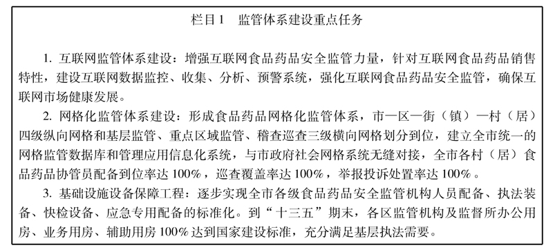 ——统一监管机构更加完善。巩固和优化市、区、街(镇)三级食品药品监管体制机制,强化重点领域、重点环节、重点市场的监管覆盖。各级食品药品监管机构基础设施建设及装备配备达到或超过国家、省相关标准,充分满足基层执法需要。