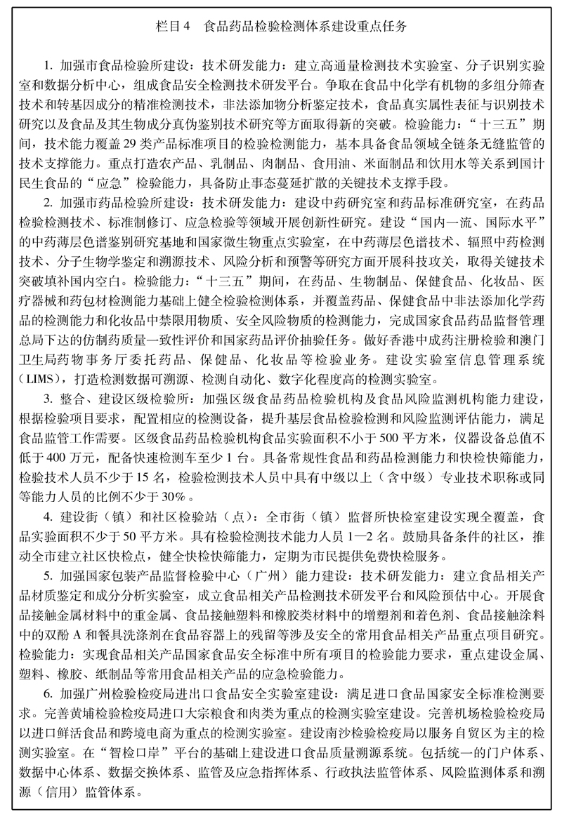——检测体系更加权威。加强检验检测体系建设,广州市食品检验所和广州市药品检验所建设成区域性国家级食品药品检测重点实验室。到2020年末,国家授权品种的独立全项检验能力达到100%。