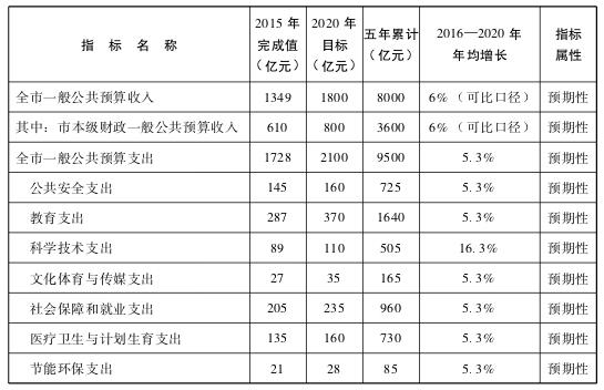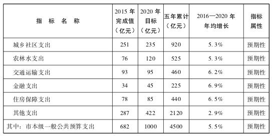 预计“十三五”时期,一般公共预算支出中公共安全累计安排725亿元,教育累计安排1640亿元,科学技术累计安排505亿元,文化体育与传媒累计安排165亿元,社会保障和就业累计安排960亿元,医疗卫生与计划生育累计安排730亿元,节能环保累计安排85亿元,城乡社区累计安排920亿元,农林水累计安排525亿元,交通运输累计安排460亿元,金融累计安排225亿元,住房保障累计安排440亿元,其他支出累计安排2120亿元。