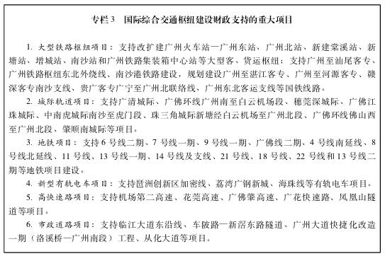 支持建设“三大战略枢纽”。依托广州地域禀赋,发挥财税、土地、规划等各项政策合力,统筹、优化和调整财政专项资金和地方政府债券的投入机制,加大推进国际航运枢纽、国际航空枢纽、国际科技创新枢纽和国际综合交通枢纽建设的财力倾斜和支持,引领枢纽型产业集群化发展。支持将南沙新区、广州港等航运枢纽建设成为新一轮对外开放重大平台,将白云国际机场航空枢纽建设成为广州国家航空经济示范区,将广州高新区、中新广州知识城、科学城、琶洲互联网创新集聚区、生物岛、大学城、天河智慧城、民营科技园等科技创新枢纽建设成为国际产业创新中心。