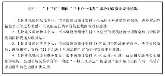 支持建设国际航运中心。全面实施建设广州国际航运中心行动计划,进一步夯实基础设施,完善集疏运体系,促进航运要素集聚,建设航运功能区、航空经济示范区,培育壮大临港、临空产业,进一步提升广州港和白云国际机场在全球港口和机场体系中的地位和资源配置能力。支持提升港口、航道、锚地、机场航站楼、跑道等基础设施“硬实力”,支持广州港深水航道拓宽工程、珠江口公共锚地、白云国际机场第二第三航站楼、第四第五跑道、第二国际货运站等一批重大基础工程建设。着力打造港口、航运“软实力”,推进建设管理体制创新,对增加集装箱班轮航线、喂给港等实施阶段性政策补贴奖励,探索研究有利于航运融资租赁项目(企业)发展的财政政策,推动提升融资租赁业务功能,设立航空产业投资基金,发挥财政资金的杠杆放大作用。