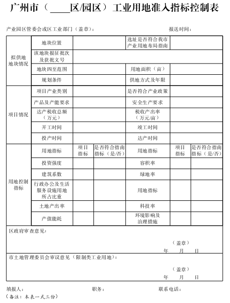 (一)由园区管理机构或区工业部门牵头会同相关部门,填写《广州市(××区/园区)工业用地准入指标控制表》,按照工业项目准入控制指标表,根据项目类型制定《项目投入产出监管协议》,并将该协议纳入土地供应文件。