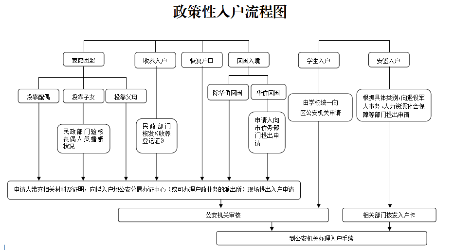 市(区)公安机关负责按计划办理家庭团聚、学生入户、收养入户、恢复户口、回国(入境)定居的入户审核工作,办理各类人员的入户手续。