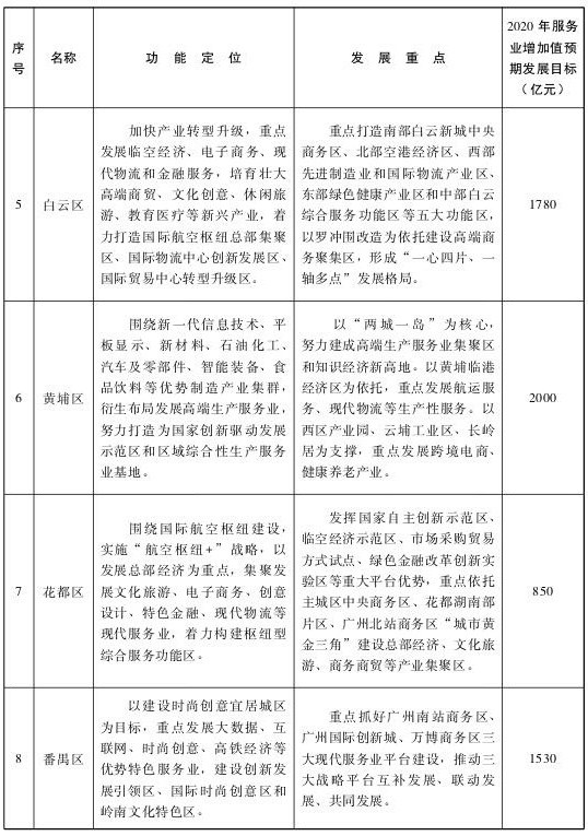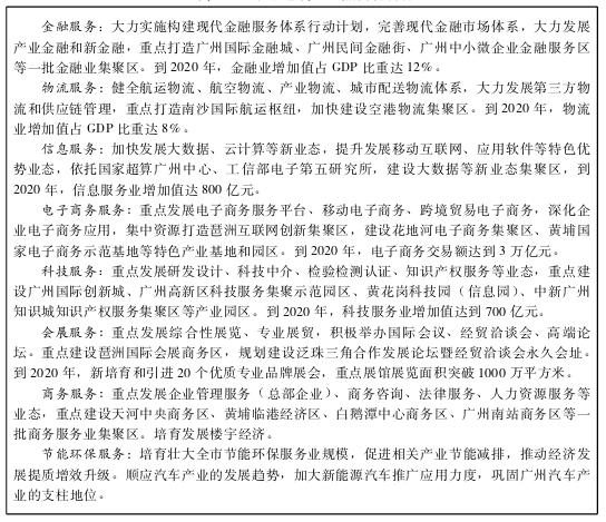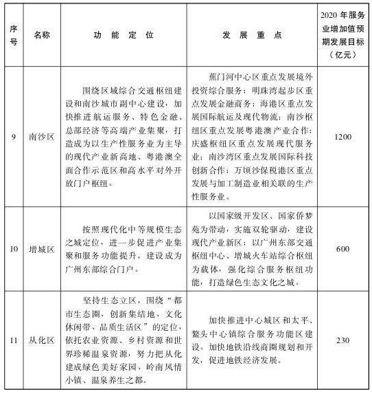 到2020年,服务经济发展规模稳步提升,产业结构和区域布局更加优化,现代物流、金融、商贸会展、信息、科技、文化创意等高端服务业占比大幅提高;具有全球影响力的国际航运枢纽、国际航空枢纽、国际科技创新枢纽建设取得重大进展,国际航运中心、国际物流中心、国际贸易中心、现代金融服务体系和国家创新中心城市功能框架与标志初步形成;国家中心城市资源配置能力和集聚辐射能力显著增强。