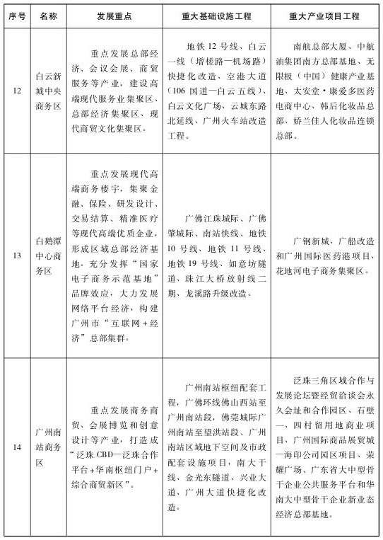 (一)强化广州国际综合交通枢纽功能。加快推进广州第二机场、白云国际机场扩建工程、白云国际机场第二高速公路工程、广州港深水航道拓宽工程、广州港南沙港区四期工程、南沙国际邮轮码头工程等一批重点工程规划建设。推动港区功能调整和海港泊位结构优化。强化与泛珠腹地城市合作,共建一批无水港,大力拓展内陆市场。积极争取航权航线开放,鼓励基地公司发展北美洲、欧洲、大洋洲、非洲等中远程国际航线。力争“十三五”期间白云国际机场新开通30条全货运航线,广州港新增30条国际班轮航线,进一步提升航空枢纽和航运枢纽的航线网络覆盖面和通达性。拓展广州铁路货运枢纽国际服务功能,加快建设中欧班列的广州始发基地,积极向国家争取设立铁路一类口岸。按照“客在内、货在外”的思路,结合产业集聚区规划,整合中心城区既有铁路货运站,推动铁路货运站场及物流园区向外围城区布局,完成中心城区内大中型货运场站外迁。推进广州集装箱中心站、南沙万顷沙物流中心、增城铁路货站建设,大力构建辐射华东、华中与西南、珠三角地区集装箱中转、联运、区域性物流配送的全国性铁路货运枢纽,与南沙海港实现联动发展。策划一批关键通道、关键节点和重点工程,加强与周边国家和地区的跨境物流体系和走廊建设。