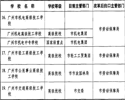 2.全市中等职业学校原则上统一以市、区(县级市)行业冠名,如“广州市电子(或机电、轻工等)职业(或技工)学校”。少数社会声誉高或特殊性专业的学校,如国家级重点学校可保留原校名。新组建的学校可视具体情况加挂原校名。