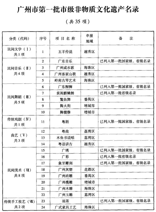 根据《国务院关于加强文化遗产保护的通知》(国发[2005]42号)、《国务院办公厅关于加强我国非物质文化遗产保护工作的意见》(国办发[2005]18号)和省政府《贯彻落实国务院关于加强文化遗产保护工作的通知》(粤府[2006]70号)有关规定,经专家评审和市非物质文化遗产保护工作联席会议评定并向社会公示,同意将“五羊传说”等35个项目列入我市第一批市级非物质文化遗产名录,现予公布。
